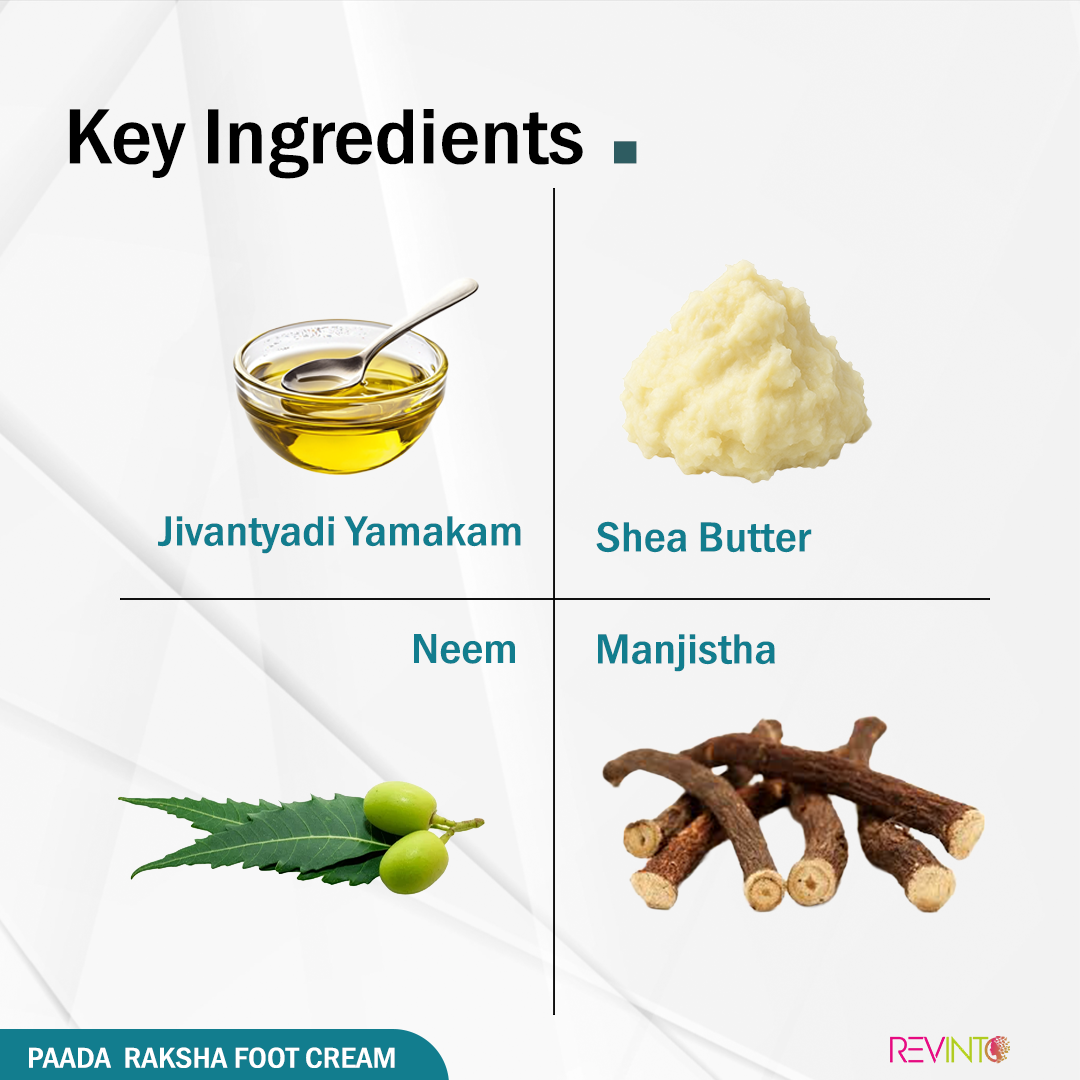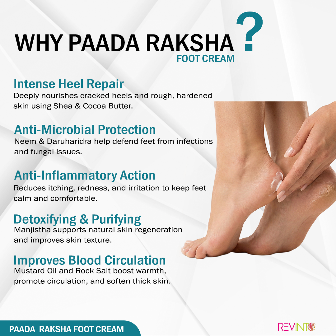 Give your feet the care they deserve with Paada Rakshak Foot Cream, a time-tested Ayurvedic blend designed to treat dry feet, cracked heels, and skin infections. Infused with the power of Jivantyadi Yamakam, Vitamin E, Shea Butter, and healing herbs like Neem, Daruharidra, and Manjistha, this foot cream not only repairs damaged skin but also revitalizes and nourishes deeply.