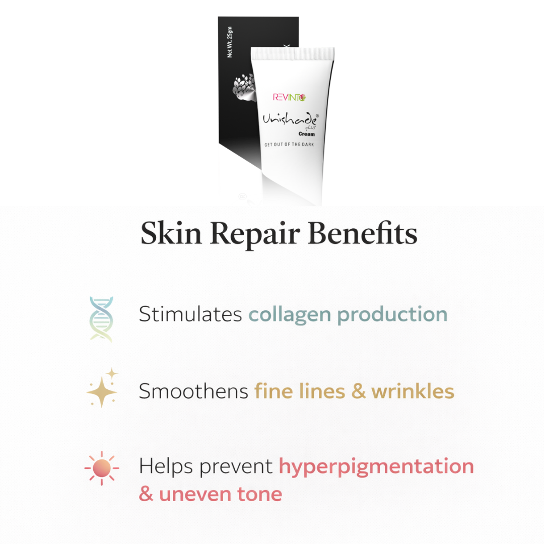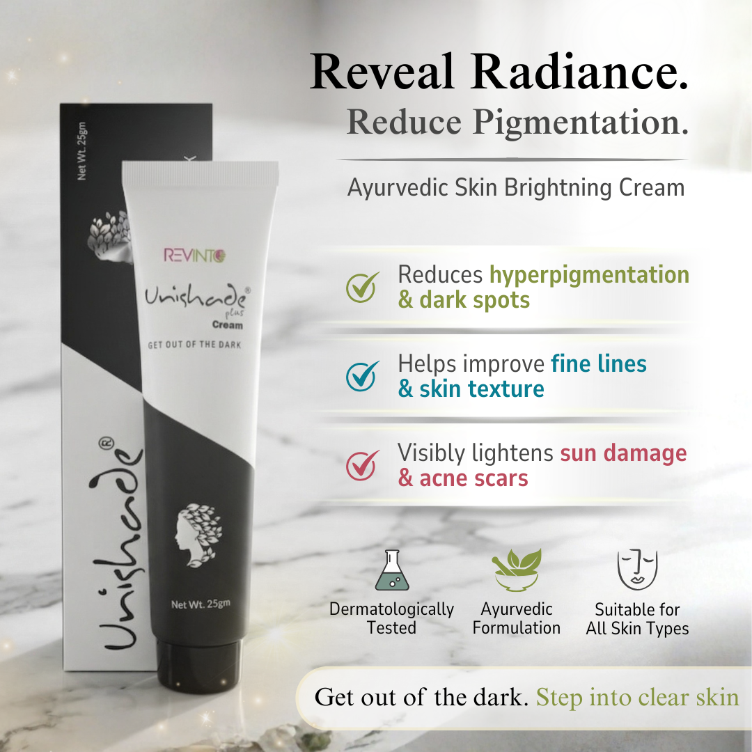 Illuminate your skin with Unishade Plus Cream, an advanced Ayurvedic-inspired skin brightening formulation designed to help improve uneven skin tone, reduce the appearance of dark spots, and support a smoother, more radiant complexion.Enriched with a thoughtful blend of effective actives and Ayurvedic ingredients, this cream works gently yet effectively to enhance your skin’s natural glow. With regular use, it helps visibly refine skin texture, promote an even-toned appearance, and reduce the look of pigmentation and dullness.Its lightweight, non-greasy formula absorbs easily into the skin, making it suitable for daily use across all skin types. Whether you’re dealing with sun damage, uneven tone, or early signs of aging, Unishade Plus Cream supports healthier-looking, brighter skin over time.
